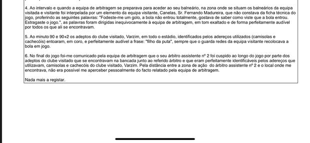 A BOLA entretanto teve acesso a parte do relatório do árbitro que descreve insultos por parte de Fernando Madureira, elemento afeto ao Canelas, que não se encontrava na ficha do jogo.