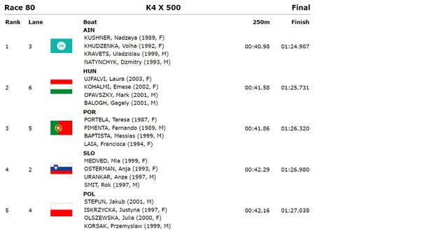 Uma equipa sob bandeira neutra venceu com 1:24.907, à frente da equipa húngara com 1:25.731. Os portugueses fizeram o tempo de 1:26.320.