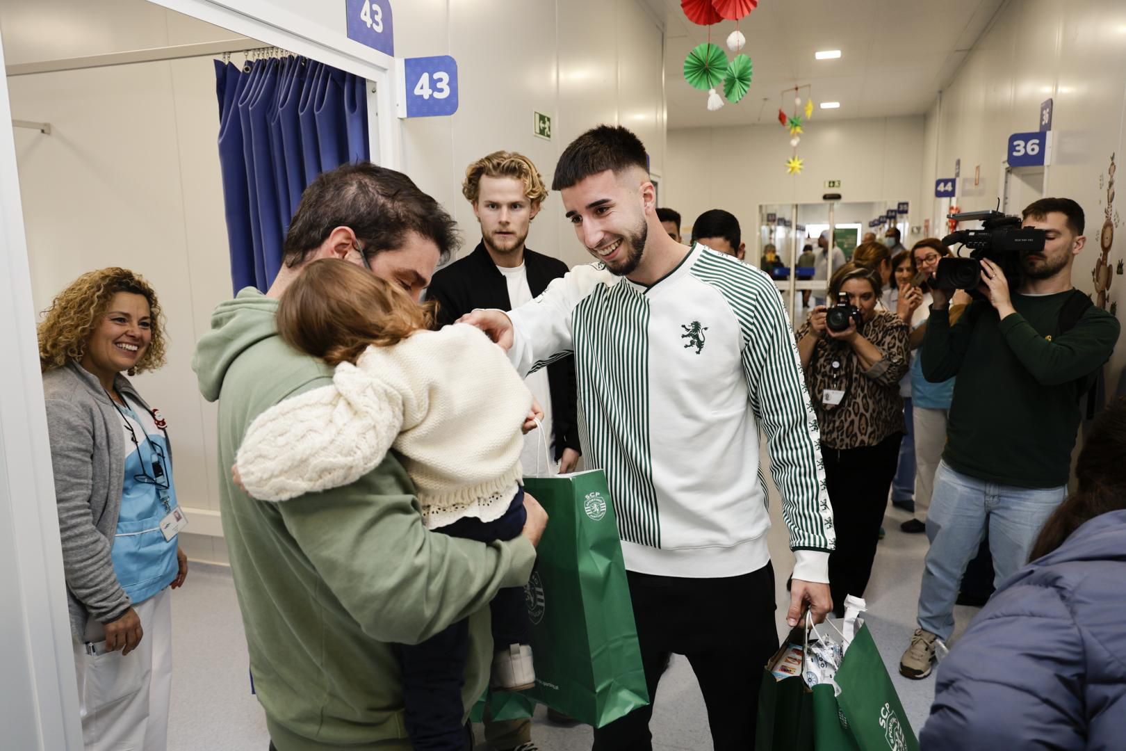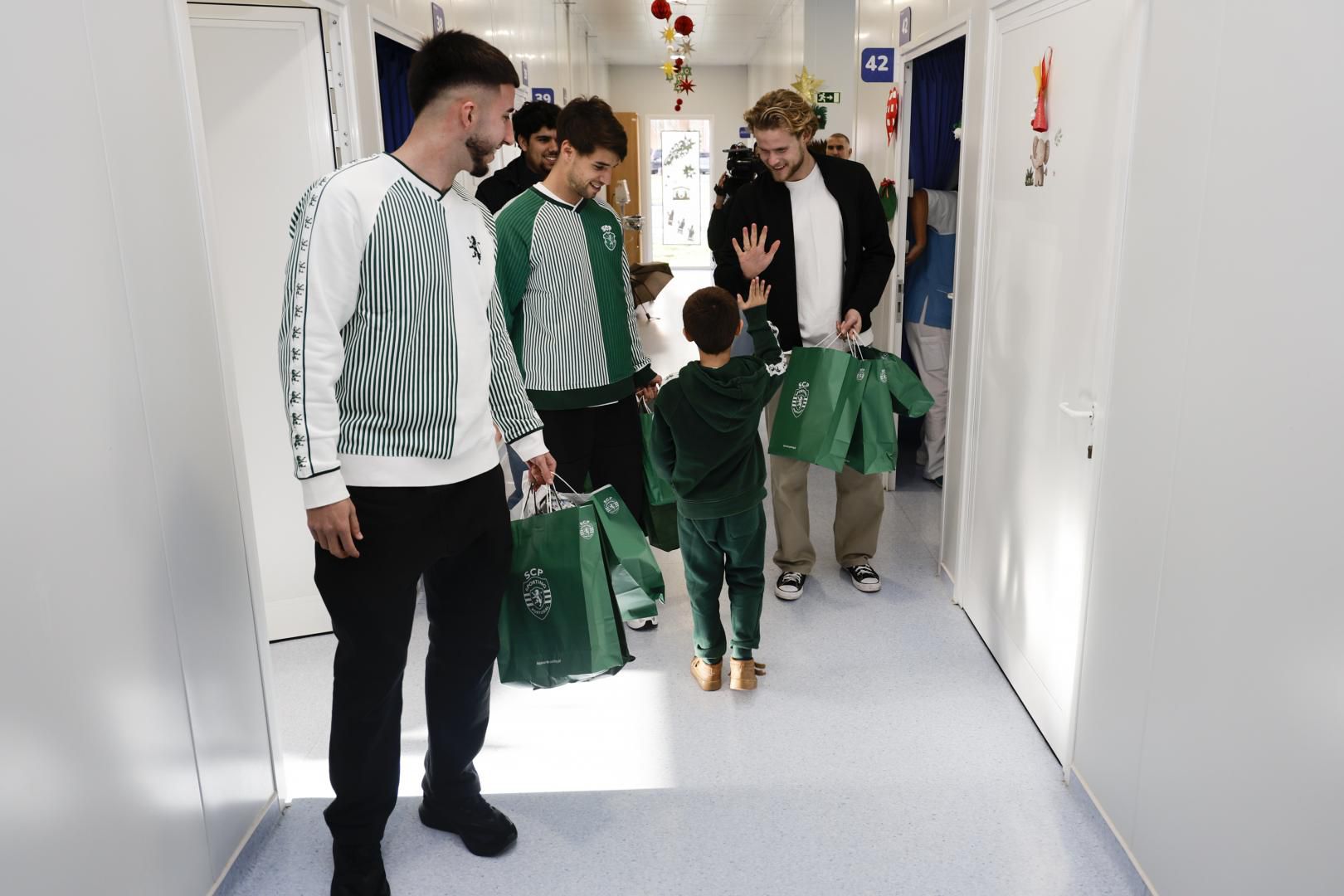 Familiares dos jogadores leoninos juntaram presentes e Hjulmand, Gonçalo Inácio e Daniel Bragança foram levá-los à ala pediátrica da unidade hospitalar de Almada