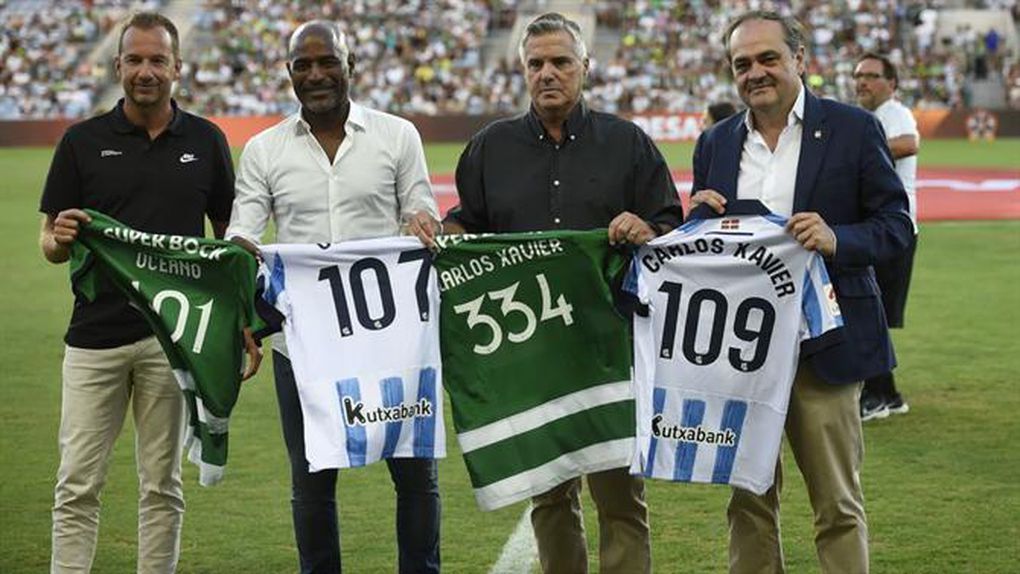 Carlos Xavier e Oceano Cruz, ladeados pelos presidentes dos dois clubes, Frederico Varandas e Jokin Aperribay, receberam o aplauso das bancadas, no centro ro relvado, e camisolas da formação basca com o número de jogos que fizeram pela Real Sociedad nessas três épocas, há praticamente três décadas: 107 jogos cumpriu Oceano pela Real Socied, 109 efetuou Carlos Xavier.