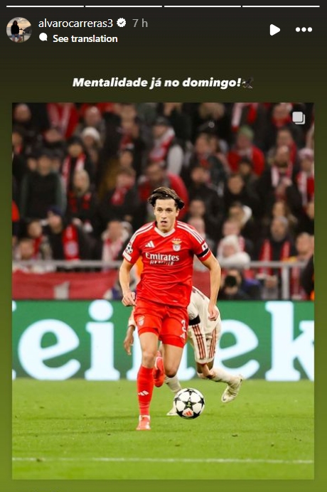 Depois da derrota com o Bayern, 0-1, para a Liga dos Campeões, Álvaro Carreras publicou uma mensagem nas redes sociais já de olhos postos no próximo compromisso do Benfica, diante do FC Porto.