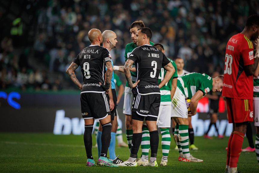 Ângelo Neto e João Nunes, do Casa Pia (ambos de costas), conversam com o árbitro Hélder Carvalho em jogo pela Liga Copyright: Maciej Rogowski/Imago. - Foto: IMAGO