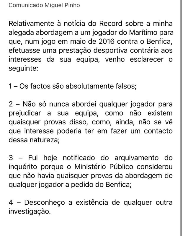 O agente Miguel Pinho, que era suspeito de ter abordado um jogador do Marítimo no sentido de prejudicar a sua equipa e dessa forma favorecer o Benfica, em 2016, foi informado de que o inquérito do Ministério Público foi arquivado, reagindo em comunicado a que A BOLA teve acesso.
