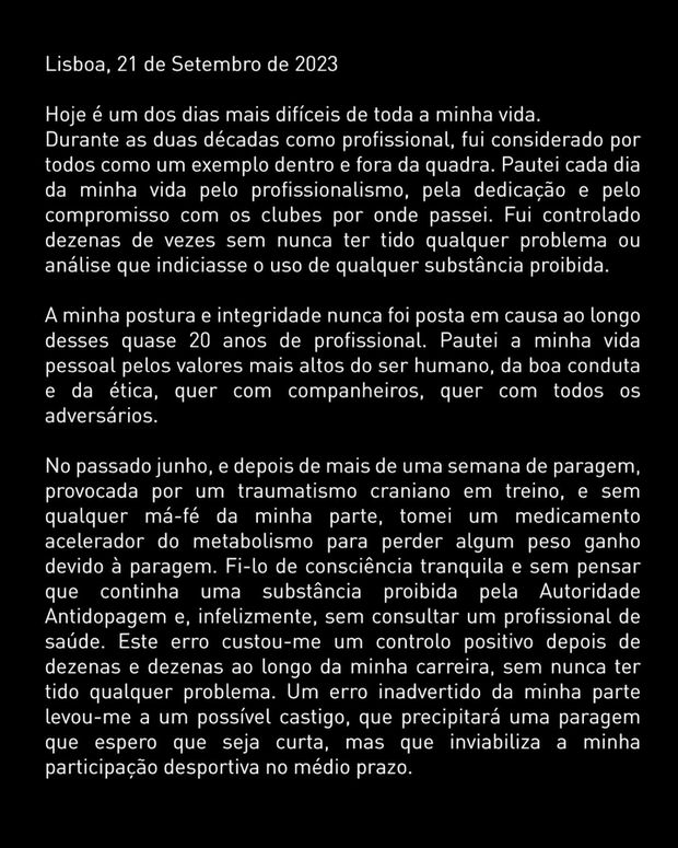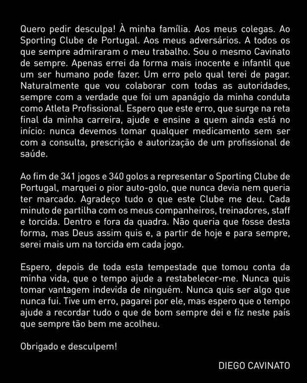 Diego Cavinato, ala de 38 anos, rescindiu contrato com o Sporting, anunciou o clube de Alvalade através das redes sociais, depois de ter testado positivo num controlo antidoping. O jogador, que chegou aos leões em 2015, marcou 341 golos em 340 jogos e venceu seis campeonatos, cinco Taças de Portugal, quatro Supertaças, quatro Taças da Liga e duas Ligas dos Campeões.
