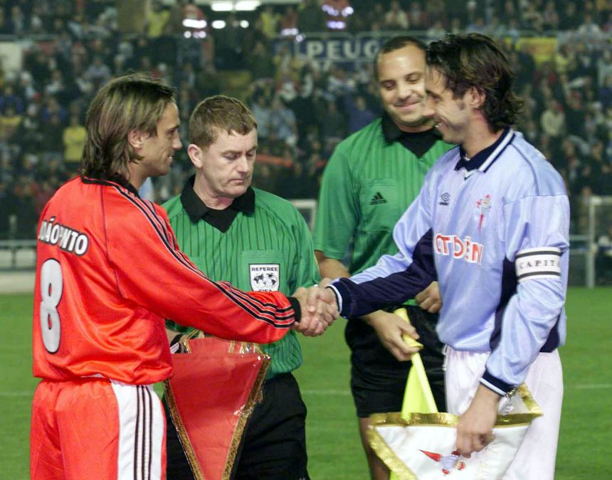 João Vieira Pinto e Mostovoi, os capitães de equipa de Benfica e Celta, na goleada da equipa de Vigo às águias em 1999 (A BOLA)