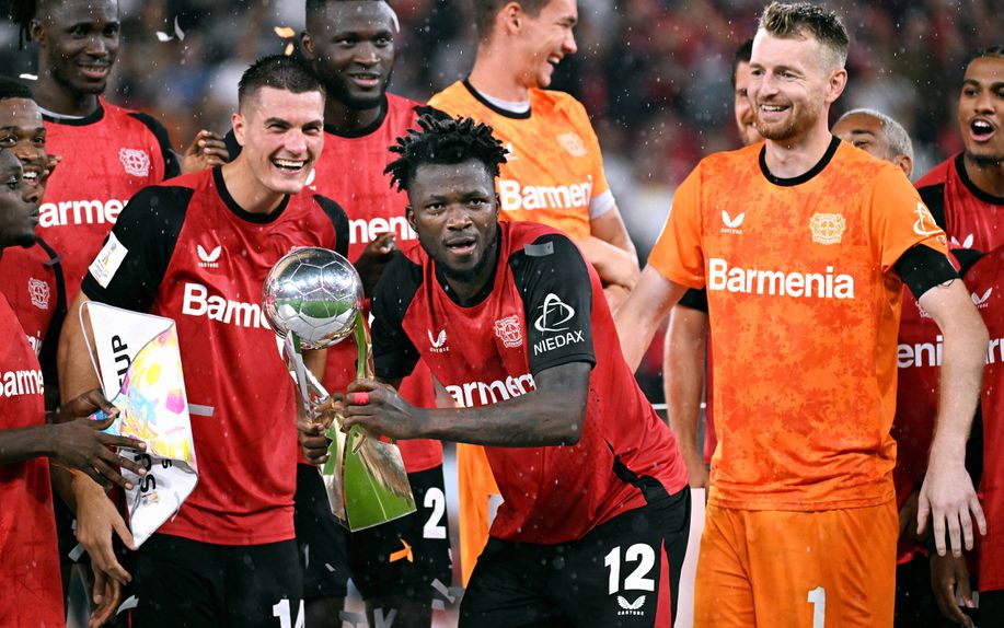 Edmond Tapsoba a celebrar a conquista da Supertaça alemã pelo Leverkusen frente ao Estugarda