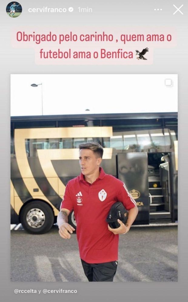 Franco Cervi recorreu às redes sociais para, uma vez mais, expressar o carinho que sente pelo Benfica. Horas depois de ter defrontado as águias pelo Celta de Vigo, no amigável no Estádio do Algarve, na sexta-feira, o extremo argentino agradeceu o carinho que lhe foi transmitido. Na publicação, Cervi recordou ainda a frase forte de Roger Schmidt quando chegou a Lisboa: «Quem ama o futebol ama o Benfica»