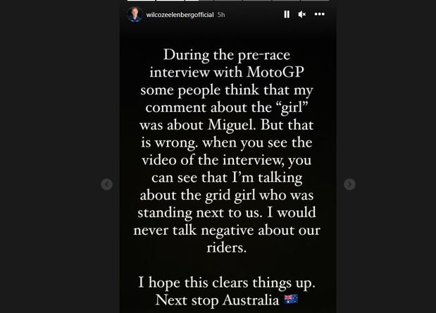 As redes sociais explodiram e Wilco Zeelenberg teve de justificar-se através de uma story no Instagram: estaria a referir-se a uma das raparigas de pista, que acompanham os pilotos na grelha. «Nunca falaria de forma negativa sobre um piloto meu», defendeu-se.