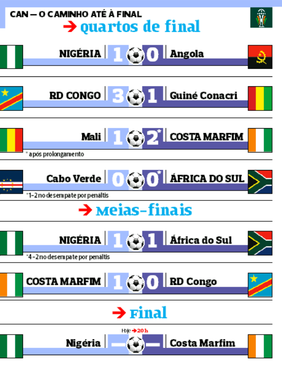 A própria Nigéria padece do síndrome de pé frio. Esta será a oitava final da história do país mais populoso de África (cerca de 220 milhões de habitantes, qualquer coisa como 15 por cento da população de todo o continente) e a verdade é que conquistou o troféu apenas três vezes (1980, 1994 e 2013), tendo perdido quatro jogos decisivos (1984, 1988, 1990 e 2000).