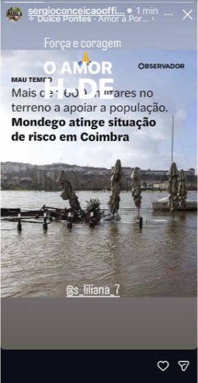 Através das redes sociais, o treinador do Al Ittihad, utilizou uma imagem de notícia do Obervador, que dá conta de «mais de 1.600 militares no terreno a apoiar a população. Mondego atinge situação de risco em Coimbra», escrevendo força e coragem, com música de Dulce Pontes, Amor a Portugal.