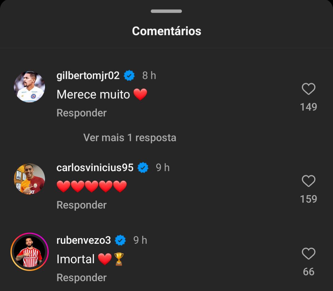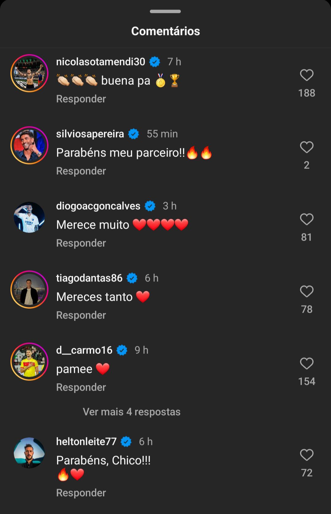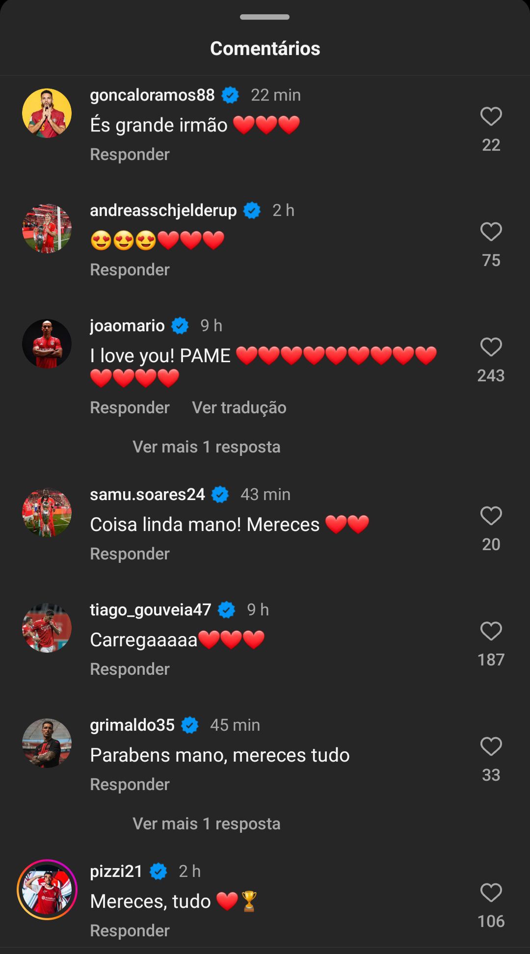 Desde Gonçalo Ramos a Schjelderup, Grimaldo a Pizzi, Otamendi, Diogo Gonçalves, Gilberto e tantos mais, a família benfiquista não esquece o antigo número 22 dos encarnados, que abraçou em janeiro a aventura helénica. «Parabéns!», «Mereces muito» e «És grande» são algumas das mensagens deixadas na caixa de comentários da publicação.