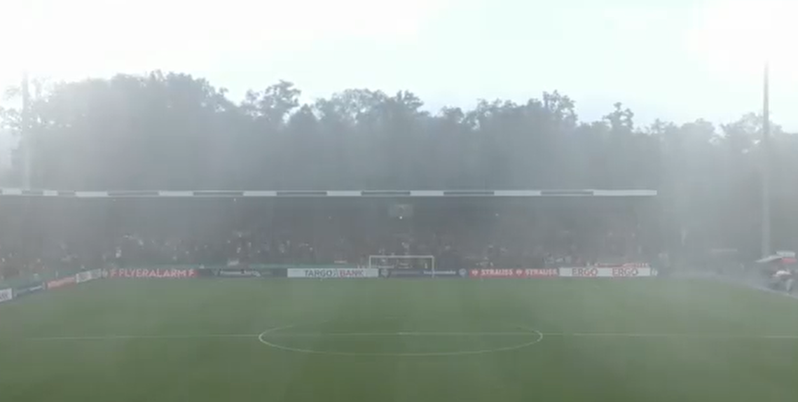 A tempestade de granizo rapidamente obrigou os protagonistas a recolherem aos balneários e os adeptos a encolherem-se debaixo da cobertura do estádio com capacidade para 10 mil espetadores. No momento da interrupção do encontro, Bayer Leverkusen e Sonnenhof Grossaspach ainda não tinham saído do nulo.