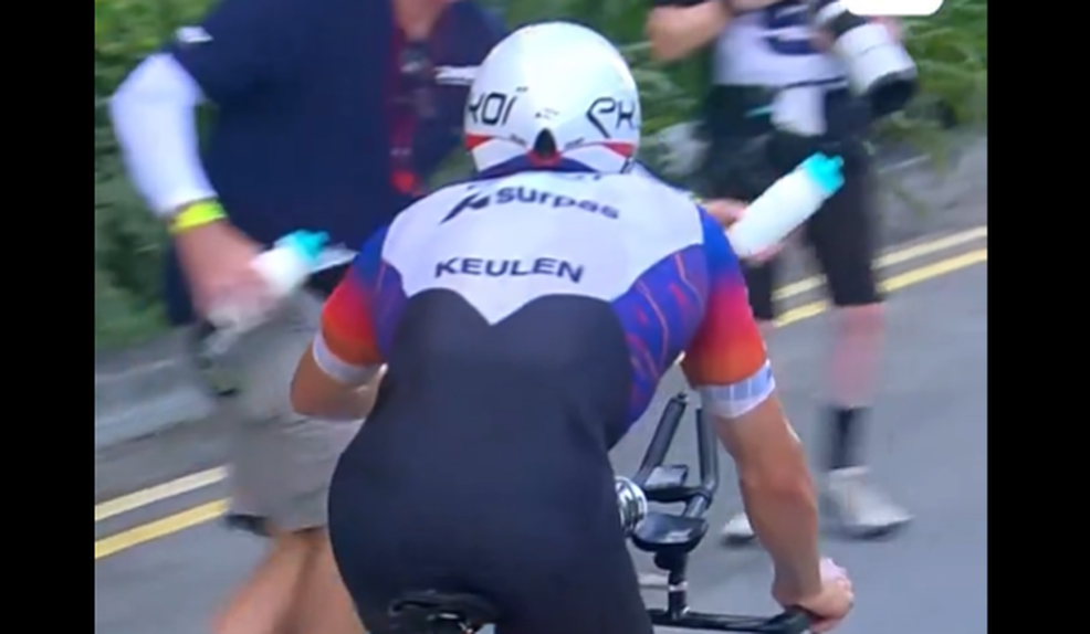 Numa das zonas de abastecimento da prova de ciclismo, Keulen tentou, não uma, não duas, não três, ou quatro, mas cinco (!!) vezes apanhar uma garrafa de água… sem sucesso.