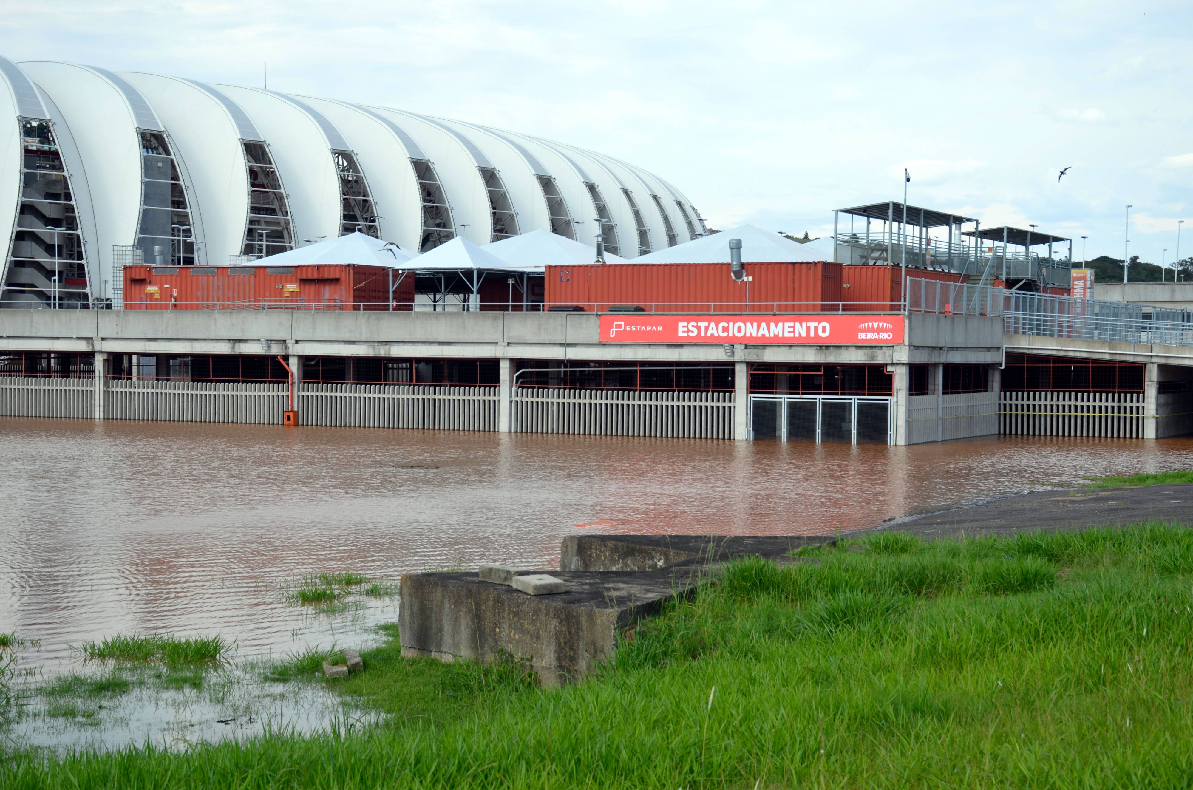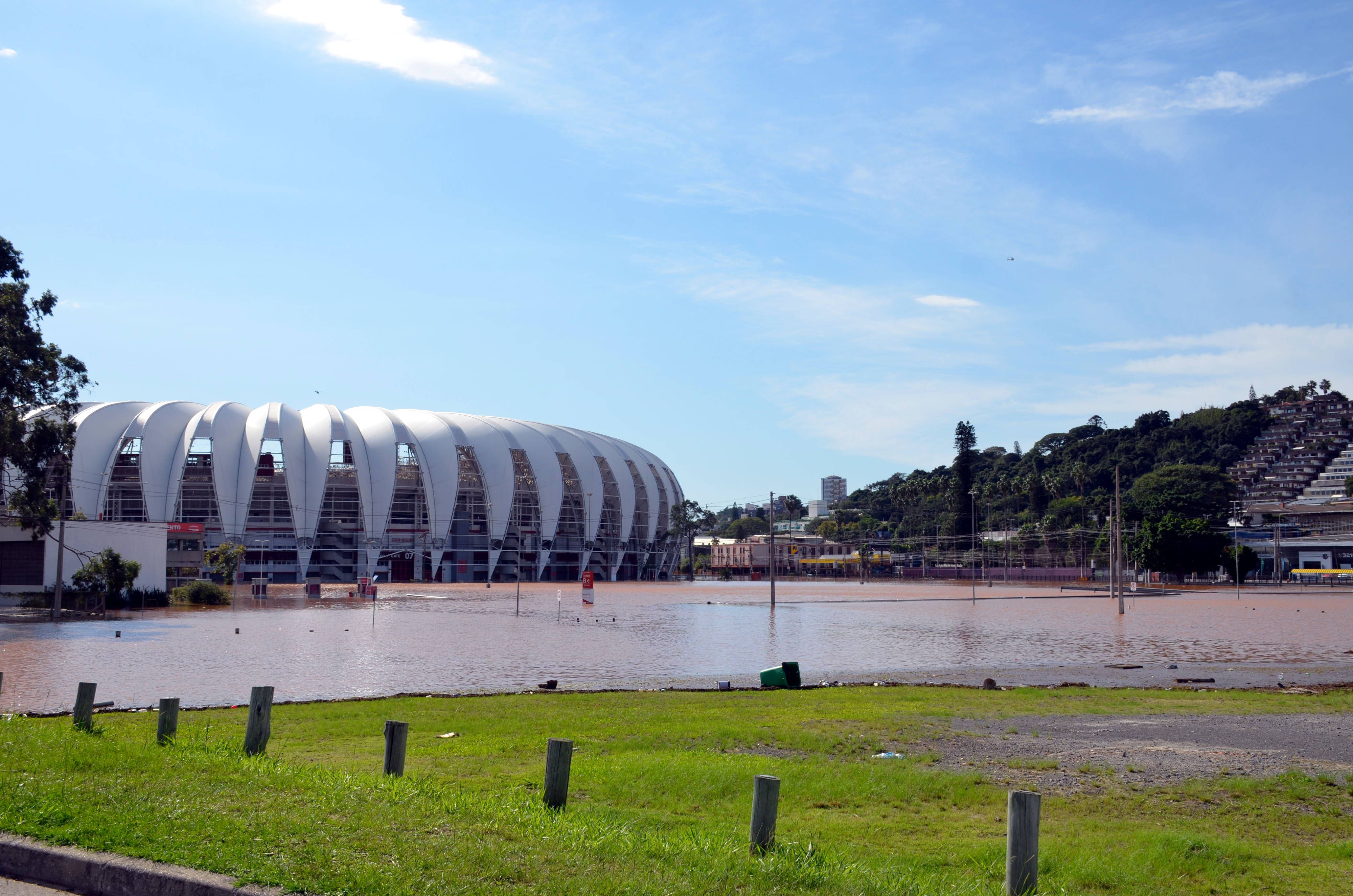 Há mais de uma semana que os estádios e os centros de treinos de Grêmio e Internacional estão alagados, em Porto Alegre, o que impede as equipas de treinar e jogar.