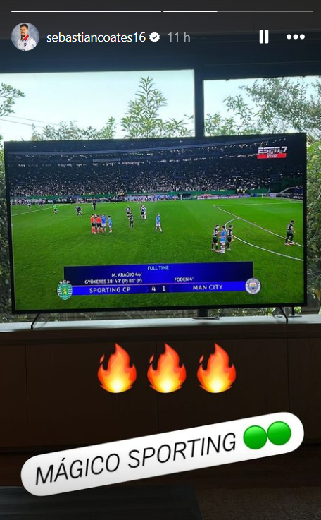 Sebastián Coates, ex-capitão do Sporting, não esquece o antigo clube e acompanhou a goleada aplicada pelos leões ao Manchester City, na Liga dos Campeões, que marcou também a despedida de Rúben Amorim de Alvalade.