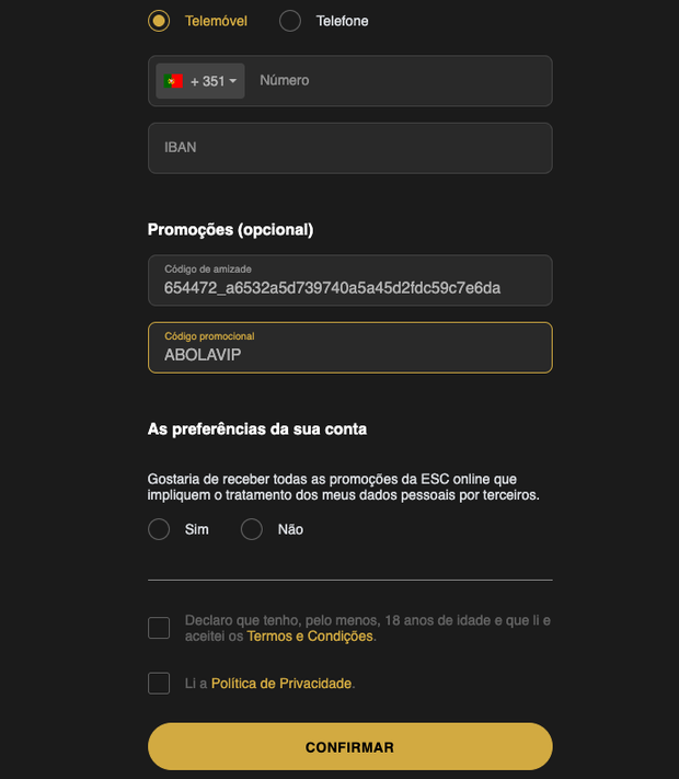 Na secção “Promoções (opcional)”, introduza o código promocional: ABOLAVIP (apostas) ou ABOLAMAX (casino).