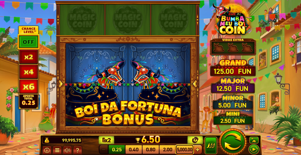 Escolhemos a slot Bumba Meu Boi Coin, desenvolvida pela Wazdan e que permite escolher entre três níveis distintos de volatilidade. O objetivo maior consiste em desencadear uma ronda de bónus com o Boi da Fortuna.
