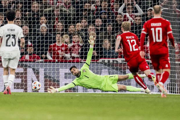 Diogo Costa defende o penálti de Eriksen no Dinamarca-Portugal de quinta-feira