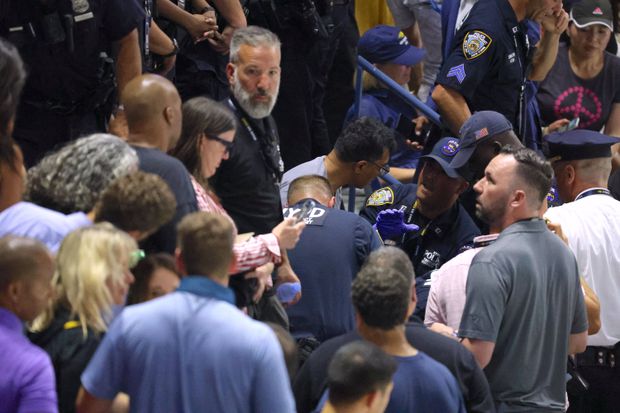 He has glued his feet to the ground. He is wearing a t-shirt saying "End Fossil Fuels". Now counted 8 NYPD officers on the scene. #USOpen pic.twitter.com/0czrDUBIna