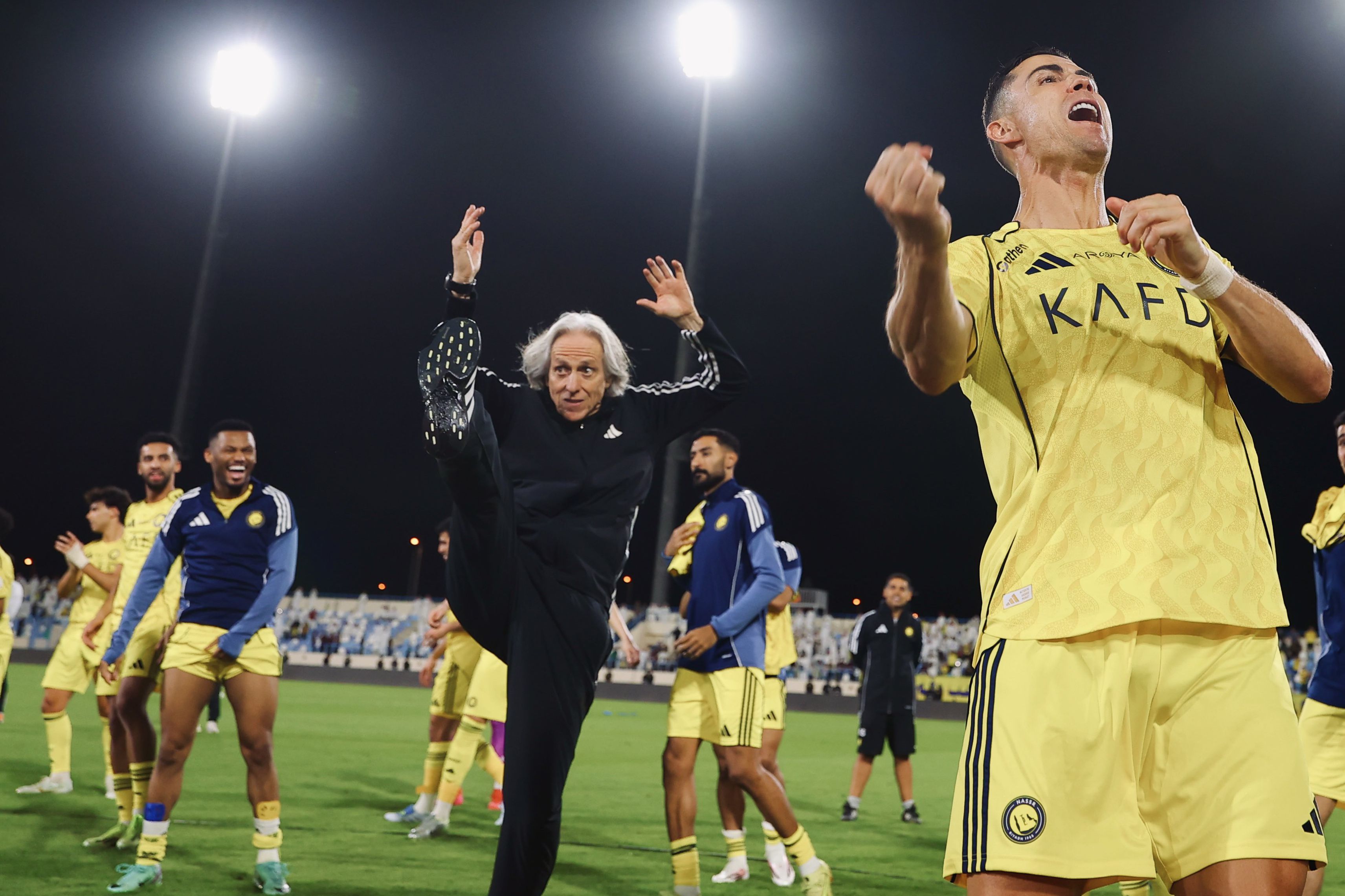 Mas no final do jogo, com mais uma vitória garantida, Jesus pôde finalmente descontrair, e na comemoração com os adeptos até esboçou um golpe de karaté caricato, mesmo nas costas de Cristiano Ronaldo, autor do primeiro golo do encontro.