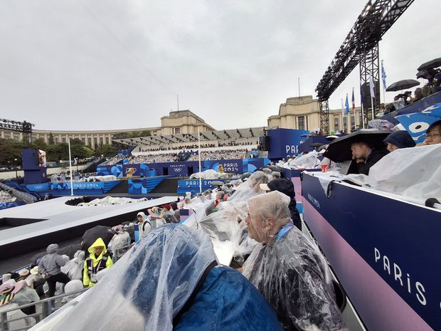O que é certo, é que ainda antes de a chama olímpica e o barco da Grécia - historicamente a primeira comitiva a entrar em cena - passarem sob a Ponte de Austerlitz, onde o desfile começou, já a chuva tomara conta do cenário.
