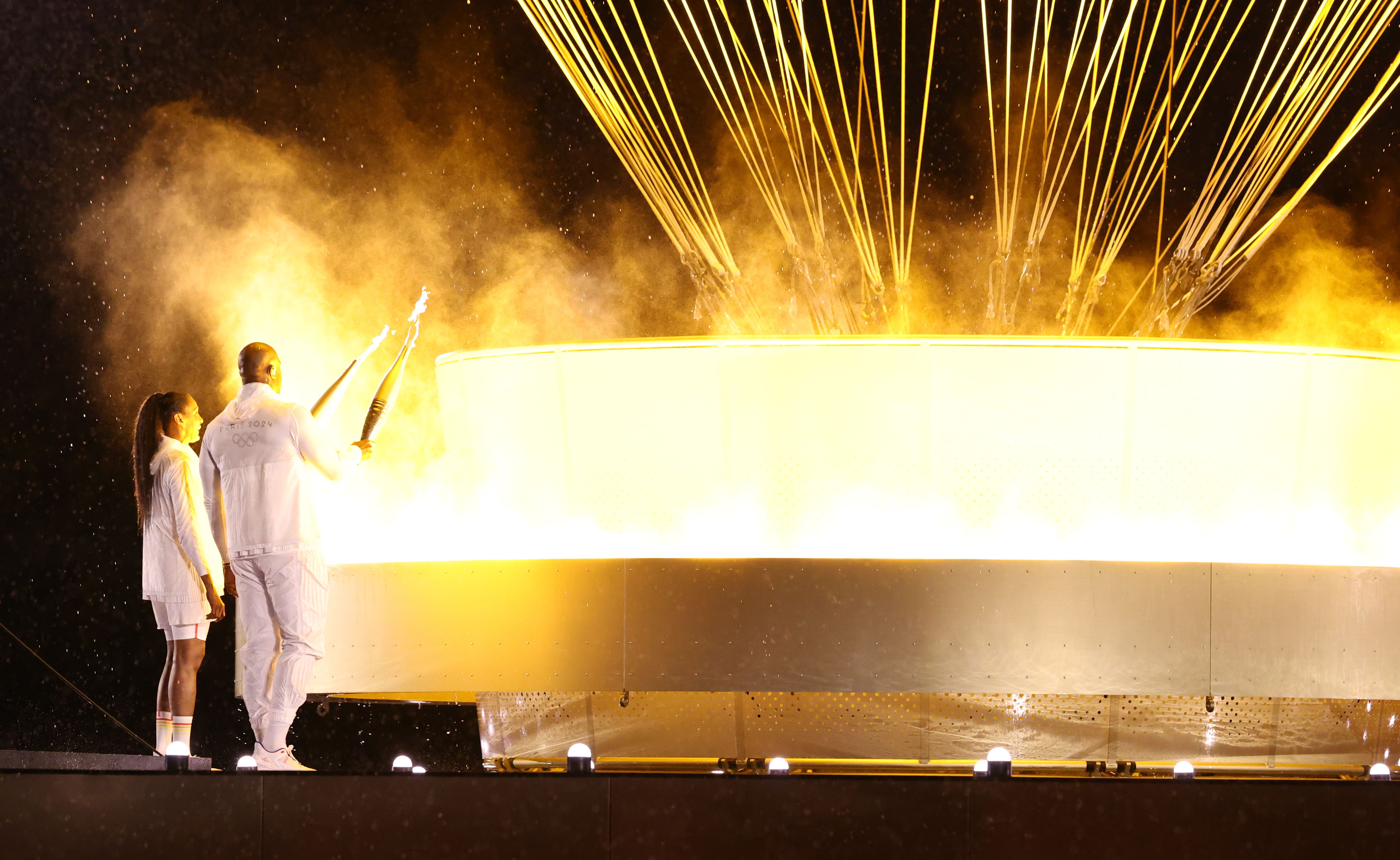 Festividade. O final da cerimónia foi uma festa incrível. E aqui não falamos de quem pôde, finalmente, ir procurar um abrigo seco. O impressionante jogo de luzes de 15 minutos no encerramento é o que de melhor fica da festa, bem como a pira olímpica em forma de balão de ar quente que vai ficar a pairar nos céus de Paris até ao encerramento dos Jogos Olímpicos.