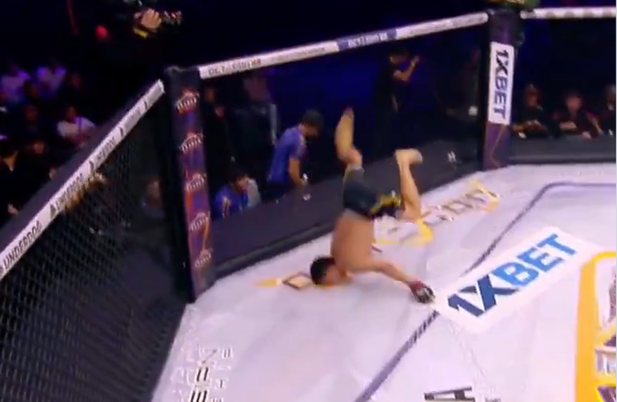 Depois de ter levado a melhor sobre Bekzat Kanatbek, no terceiro round, o cazaque quis celebrar o momento com um mortal, mas o movimento não saiu como esperado e acabou por bater com a cara no chão.