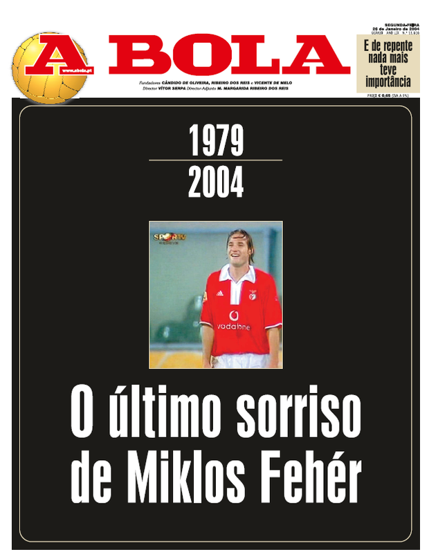 E então sentámo-nos e em cinco minutos decidimos que a capa seria toda a negro, com uma fotografia, porque o Fehér, antes de lhe dar o ataque, antes de ter aquela síncope, ele levou um cartão amarelo e riu-se para o árbitro. Então temos a foto do Fehér a rir e chamámos-lhe o último sorriso de Miklos Fehér. Nós tínhamos uma orelha, que ainda temos hoje na capa de jornal, que às vezes é publicidade e às vezes não é. Nesse dia não era. Então o que nós pusemos na orelha foi... E a partir daqui nada mais interessou. Portanto, foi o tema único desse dia, dessa edição, e marcou-me muito.