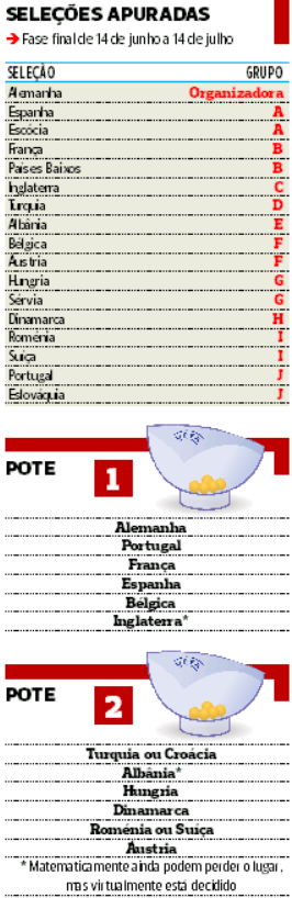 Assim, Portugal fica com a certeza de que evita mesmo os outros cinco grandes tubarões do futebol europeu na primeira fase do Campeonato que se realiza entre 14 de junho e 14 de julho do próximo ano, na Alemanha. Fora desse lote, mas claramente abaixo de alemães, franceses, belgas, espanhóis ou ingleses, a Itália será potencialmente o adversário mais complicado, mas ainda nem tem o apuramento garantido.