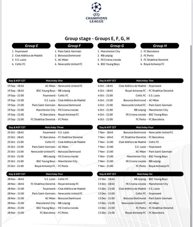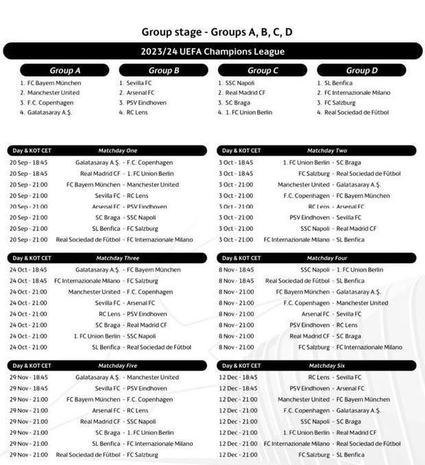 Benfica (Grupo D), FC Porto (Grupo H) e SC Braga (Grupo C) já conhecem o calendário para a Liga dos Campeões 2023/24.