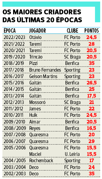 O sueco imita o portista Hulk, único que nos últimos 25 anos colou o título de melhor marcador com o de também maior criador de golos (em 2010/11) e sucede ao ex-portista Otávio - o luso-brasileiro, companheiro de Cristiano Ronaldo no Al Nassr, venceu em 2022/23 depois de ser 2.º nas três anteriores épocas - e passa a incluir uma galeria de criativos de excelência onde brilham o dragão Drulovic (conquistador de quatro triunfos seguidos entre 1996 a 1999) e trivencedores como Balakov, Deco, Ricardo Quaresma e Nico Gaitán.
