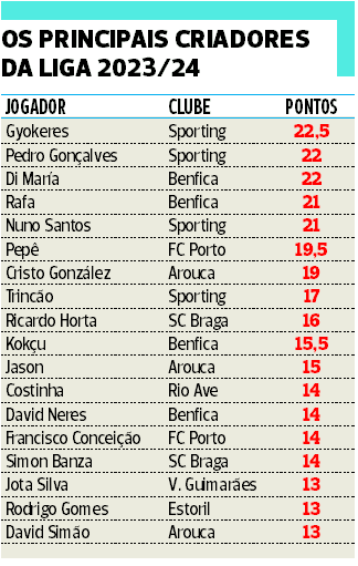 O topo da tabela dos maiores criadores da Liga é hegemonicamente ocupado por jogadores pertencentes aos quatro grandes, com a honrosa exceção do surpreendente espanhol Cristo González (7.º ao fabricar 19 golos da equipa da serra da Freita), único atleta da classe média do futebol português a surgir entre os dez primeiros e um dos elementos do trio espanhol levou o Arouca a ser exaltado pelo seu poder de fogo atacante, quinto melhor da campeonato.