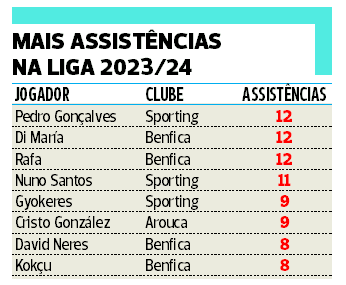 Colados ao sueco surgem Pedro Gonçalves e Di María - prejudicados por não terem sofrido qualquer penálti assinalado - e logo a seguir Rafa e Nuno Santos. Menção final para o 27 benfiquista, presente no pódio das anteriores três épocas e que, tal como em 2022/23, liderou a tabela com largo avanço na 1.ª volta mas foi penalizado por uma segunda parte de temporada menos influente.