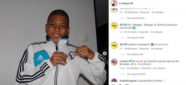 Na publicação nas redes sociais em que Kylian Mbappé exulta com a chegada ao Real Madrid, ilustrando a publicação com fotografias, uma das quais ao lado de CR7, nos tempos em que o português jogava no clube espanhol, o jogador do Al Nassr deixou o seguinte comentário: «É a minha vez de ver. Estou entusiasmado por te ver brilhar no Bernabéu.»