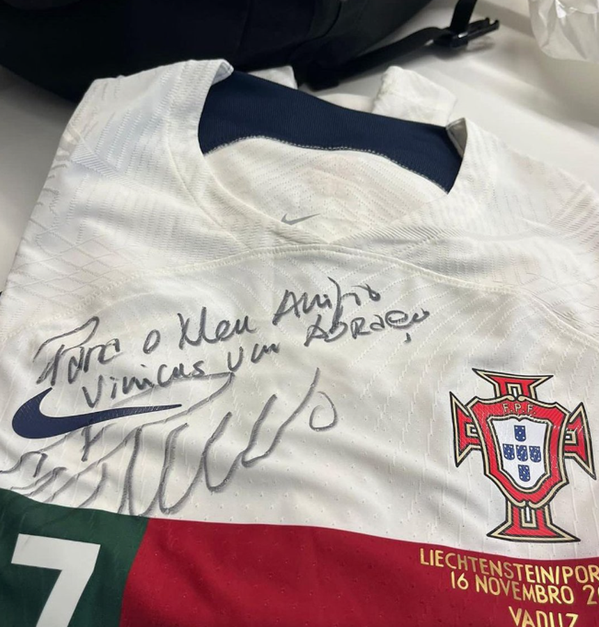«Para o meu amigo Vinícius, um abraço», foi a mensagem que Ronaldo deixou na camisola para o craque do Real Madrid.