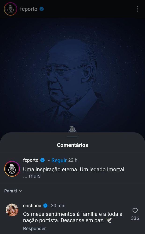 O internacional português comentou a publicação dos dragões nas redes sociais, lamentando o falecimento do seu antigo presidente e apresentando as suas condolências à família e amigos, assim como aos adeptos do clube.