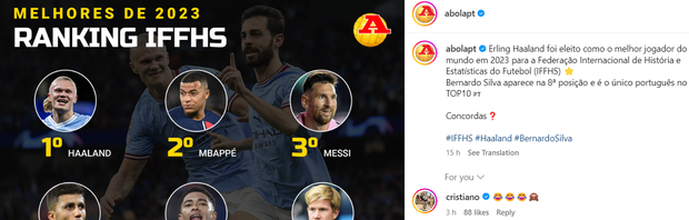 Cristiano Ronaldo é que parece não ter gostado das escolhas da IFFHS, e escolheu uma publicação nas redes sociais do jornal A BOLA, no caso o Instagram, para deixar a sua opinião (através de emojis).