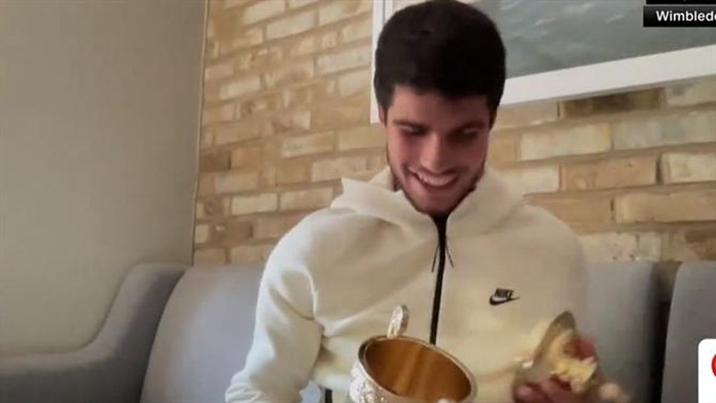 Carlos Alcaraz está nas nuvens depois de ter vencido Wimbledon. Esta segunda-feira em não se livrou de inúmeros compromissos com a imprensa, e num direto com a CNN americana acabou por distrair-se quando lhe pediram para mostrar melhor a Taça.