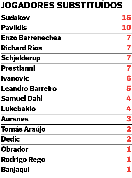 Já Leandro Barreiro foi a peça encarnada mais vezes chamada ao jogo saltando do banco (11 ocasiões, três delas ainda com Bruno Lage), seguindo-se Franjo Ivanovic e Gianluca Prestianni (ambos com 9 cada).
