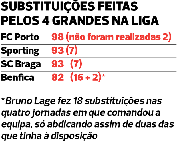 Como se constata no quadro publicado nesta página, Francesco Farioli só não fez duas das 100 substituições possíveis na equipa do FC Porto (cinco em cada uma das 20 jornadas do campeonato até agora disputadas), enquanto Rui Borges e Carlos Vicens, respetivamente treinadores de Sporting e SC Braga, apenas abdicaram de sete cada um. Mourinho não recorreu a um total de 16 suplentes — já Bruno Lage (treinador que iniciou a temporada no comando do Benfica) esteve no banco em quatro jornadas e dispensou duas das 20 substituições a que tinha direito; e em 2024/25 só não utilizou um total de nove substituições na prova. Ou seja, José Mourinho renunciou a tantas alterações nesta Liga como os seus três principais rivais juntos.