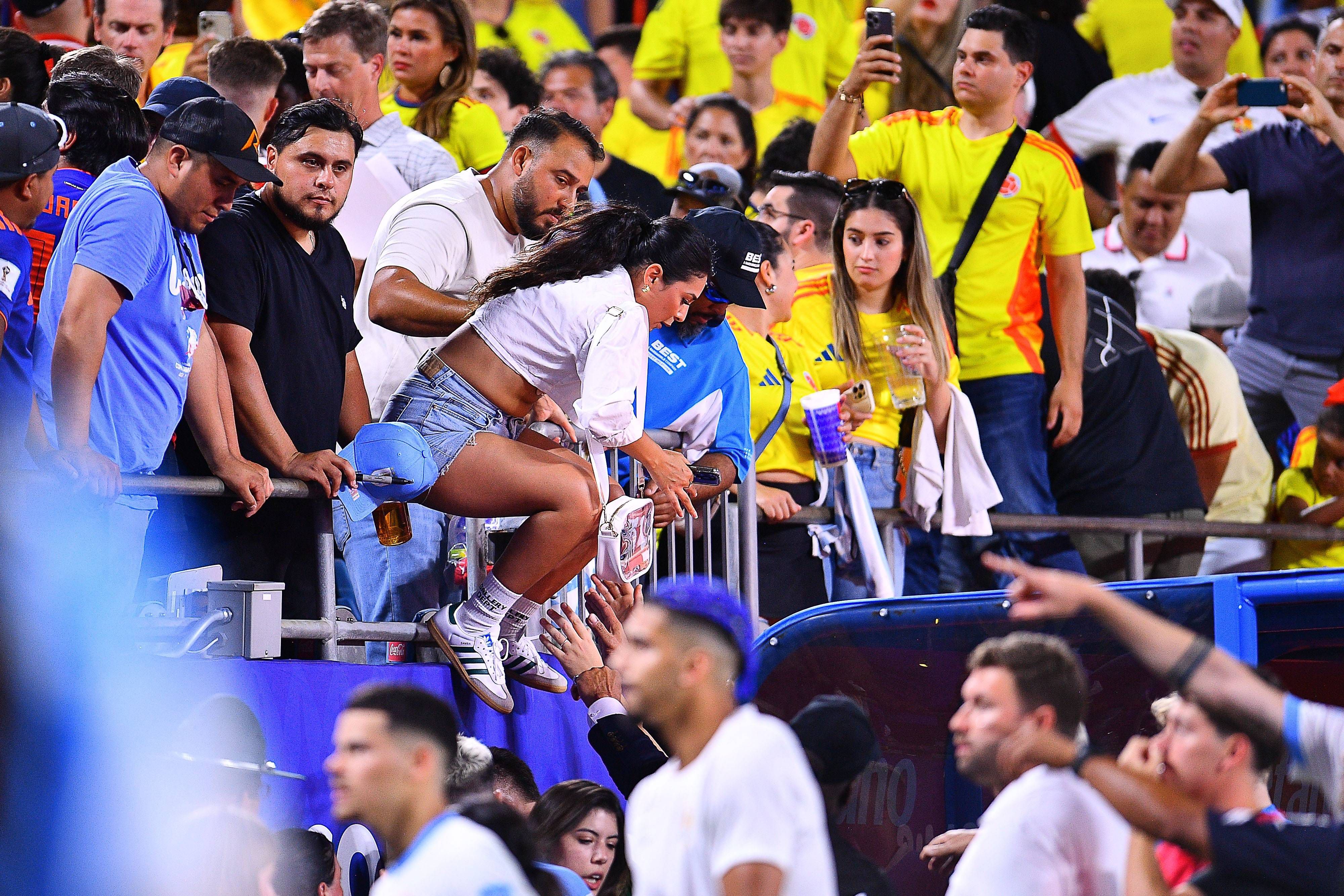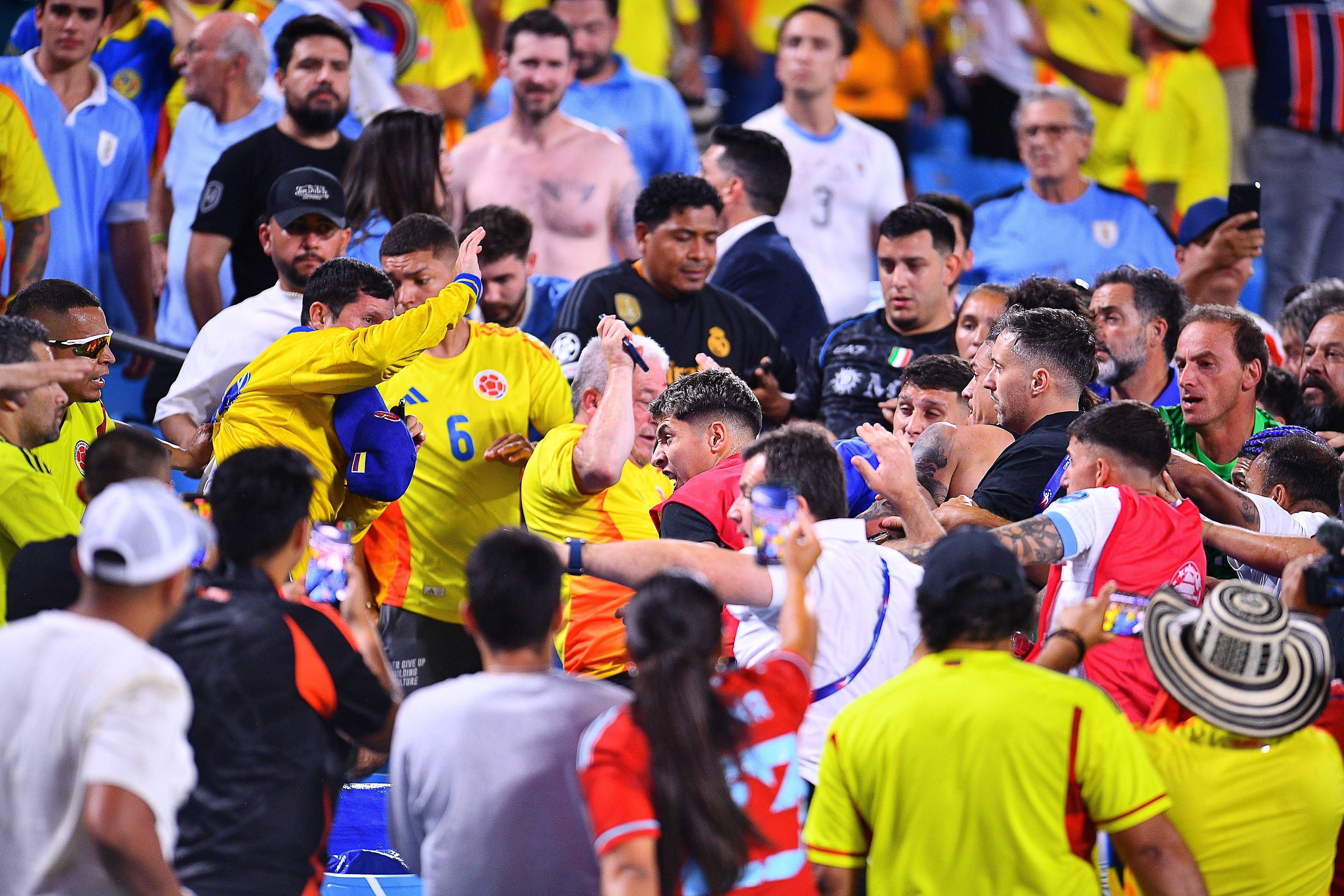 O Uruguai-Colômbia desta madrugada terminou da pior forma, com jogadores da celeste em cenas de pancadaria com adeptos colombianos na bancada, aparentemente para defender as famílias que se encontravam naquele setor.