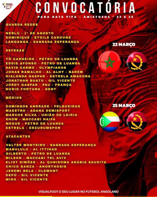 Na lista, estão ainda os centrais Kialonda Gaspar (Estrela da Amadora) e Buatu (Gil Vicente), os médios Marcos Silva (UD Leiria) e Domingos Andrade (Felgueiras) e os avançados Miro e Depú (ambos do Gil Vicente).