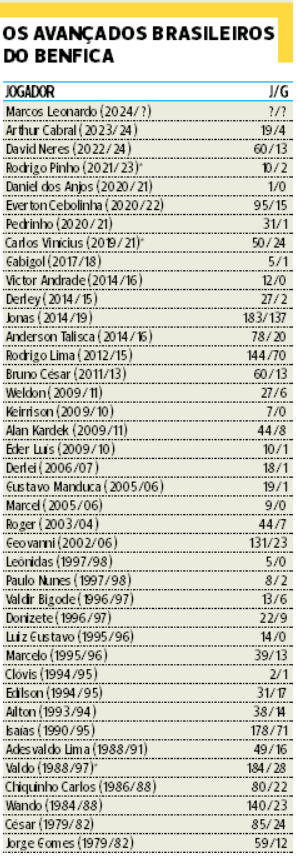 Marcos Leonardo é a mais recente aposta do Benfica no mercado brasileiro, que já lhe deu de tudo. O maior goleador, Jonas, chegou a custo zero, na condição de desempregado, oriundo de Valência; craques acima de qualquer suspeita, como Paulo Nunes ou Gabigol, tiveram passagens efémeras; e acabaram por ser apostas no mercado interno, Isaías adquirido ao Boavista e Lima ao SC Braga, a mostrarem-se influentes e inesquecíveis. No Benfica houve de tudo, desde a fase em que vinham grandes nomes, como Valdo, até alturas em que tudo o que mexia no Brasil tinha direito a atravessar o Atlântico rumo à Luz. Os últimos anos trouxeram alguma assertividade, mas nem mesmo assim existem certezas absolutas, porque no futebol não há apostas à prova de bala.