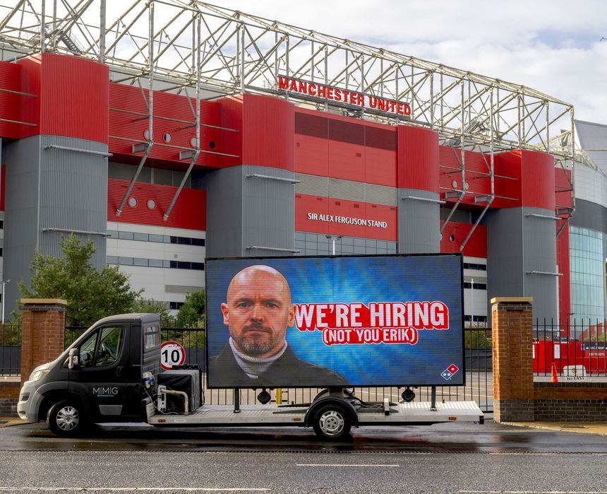 «Estamos a contratar (a ti não, Erik)», pode ler-se num post da conta oficial da Domino's no Reino Unido, que fez questão de exibir o painel publicitário em frente a Old Trafford.