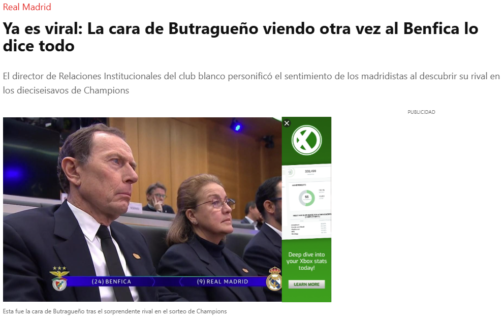 Já o Sport destacou que «a cara de Emilio Butragueño ao ver outra vez o nome do Benfica diz tudo». «O diretor de relações institucionais do clube representou o sentimento dos madridistas ao conhecerem o seu adversário no play-off da Champions. Impassível, com um gesto imóvel, mas que parecia demonstrar um sentimento de contrariedade, e olhando para o público, Butragueño exemplificou o sentimento que muitos adeptos madridistas devem ter sentido.»