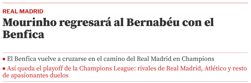 Já o Mundo Deportivo aborda o desejo de alguns adeptos do Real de verem Mourinho no Bernabéu… só que no lado dos merengues. «Será um encontro especial para o português e para uma parte do madridismo que não o esquece e que, de facto, ficaria muito contente com o regresso de Mourinho ao banco do Real Madrid.»