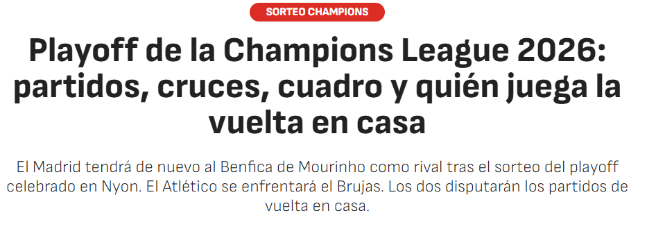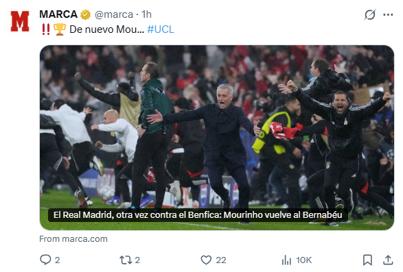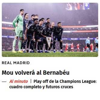 «De novo Mou…», publicou a Marca nas redes sociais, destacando que o sorteio dita «a primeira vez que Mourinho volta ao Bernabéu desde a saída do Real Madrid em 2013». O diário também destaca as «únicas» vantagens que o Real tirou do sorteio: «os espanhóis jogarem a segunda mão em casa» e «evitarem uma viagem ao norte da Noruega», onde poderia jogar com o Bodo/Glimt.