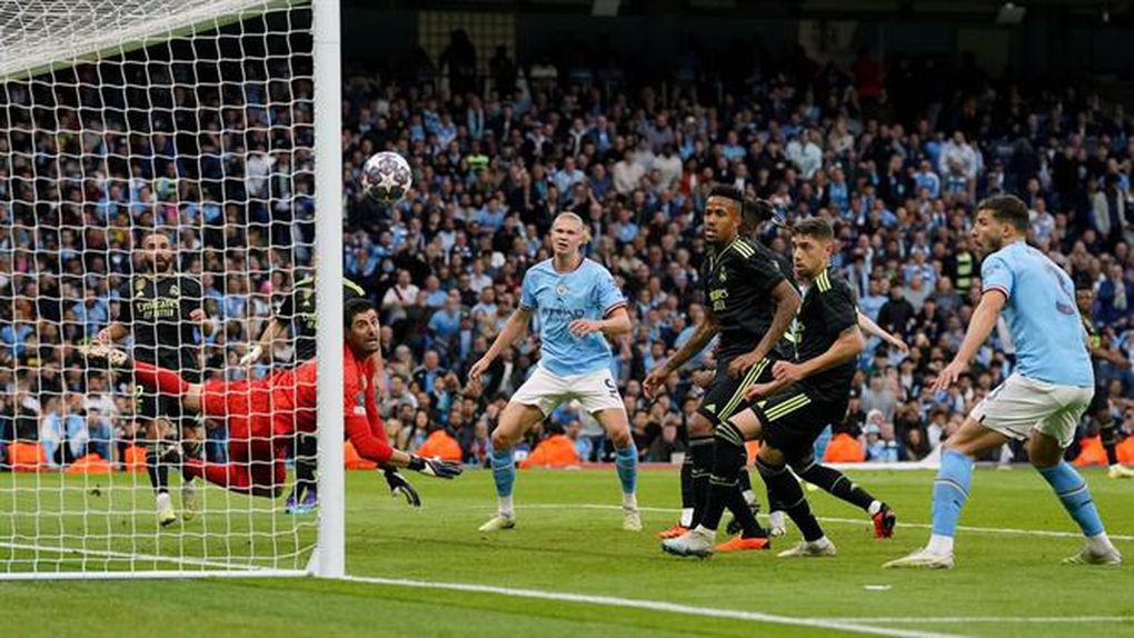 Thibaut Courtois (Real Madrid) assinou uma defesa inacreditável para travar o cabeceamento de Erling Haaland (Manchester City), em jogo da segunda mão das meias-finais da Liga dos Campeões.