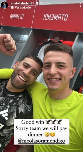Apesar disso, tudo correu bem para as águias e, após o encontro, Trubin recorreu às redes sociais para mostrar a felicidade da equipa. «Boa vitória. Desculpem equipa, pagamos o jantar!», escreveu, em jeito de brincadeira, identificando o colega Otamendi.