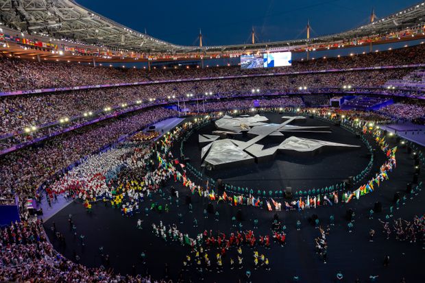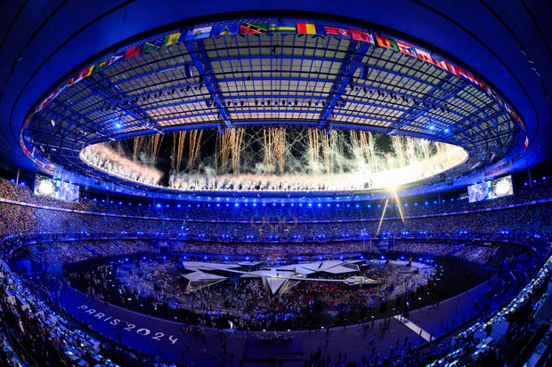 A despedida dos Jogos Olímpicos de Paris começou com Tom Cruise a atirar-se do teto do estádio preso a um cabo, e aterrar ali na costa leste dos EUA do palco.